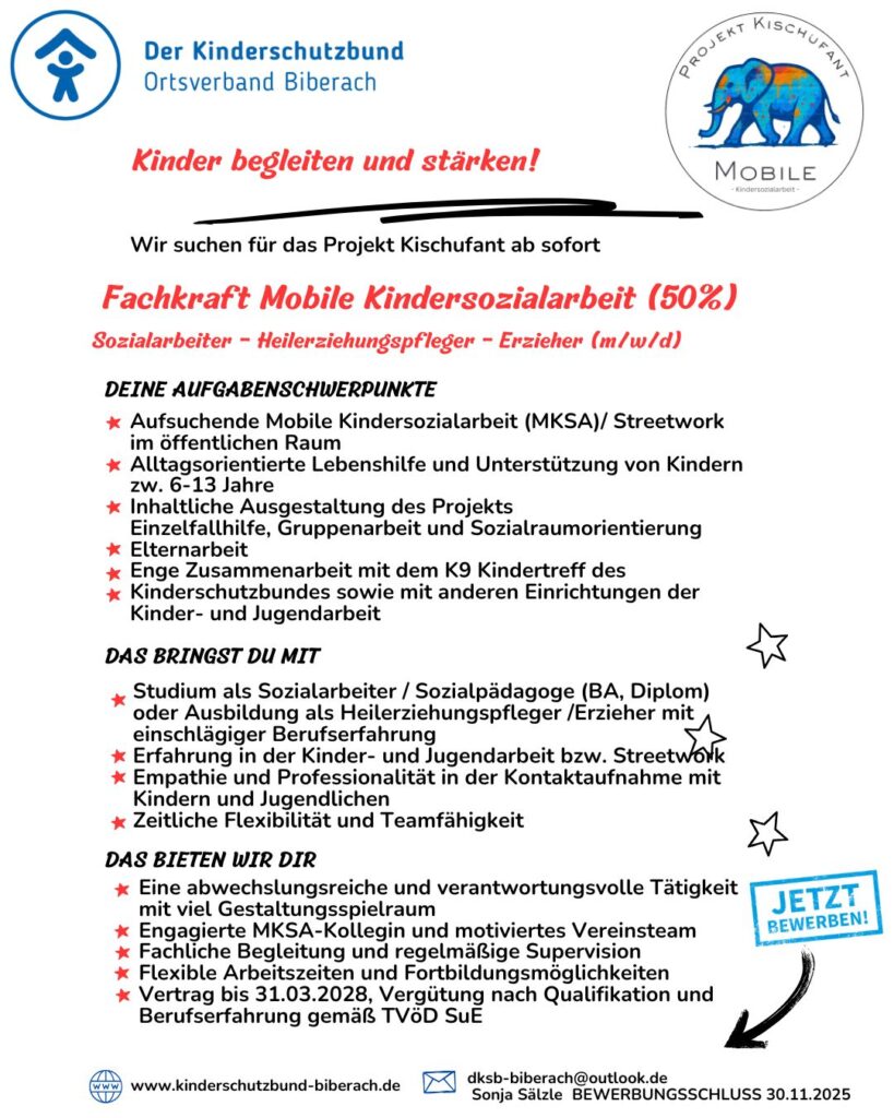 Der Verein Jugend Aktiv deckt den Bedarf an mobiler Jugendsozialarbeit in Biberach für Jugendliche ab 14 Jahren ab. Zusätzlich braucht es aus Sicht des Kinderschutzbundes Biberach eine präventive mobile Kindersozialarbeit für die Altersgruppe der 6- bis 13-Jährigen. Diese Kinder werden bisher in Biberach nicht umfassend erreicht.